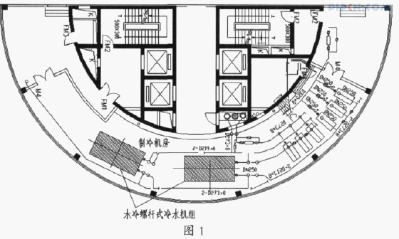 该高层建筑机电安装工程属于二期续建工程,因一期完成的地下室无预留二期续建工程的机房用地,因此二期续建部分的空调主机房设于 30 层,而 29 层使用功能为餐厅,制冷机房内包含的设备有 2 台 300RT 的螺杆式冷水机组,3 台空调冷冻水泵,3 台空调冷却水泵。主机房平面布置图如图 1。(参考《建筑中文网》)