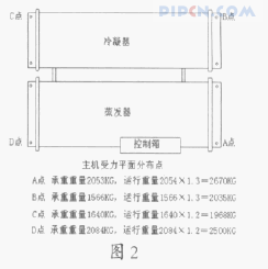 水冷螺杆式冷水机组的冷凝器和蒸发器是分体连接,形成两个基础底座,设备四个受力点受力均不同,受力点受力分布情况如图 2。