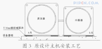 设计时未充分考虑设备层设备振动造成的相关影响,忽视了设备层机组减振的重要性,因此原设计方案中只要求冷水机组直接放与设备基础上,主机与基础间放置平面尺寸为 25cm×25cm,厚度 30mm 的橡胶减振垫作为设备减振措施,设计要求安装工艺如图 3: