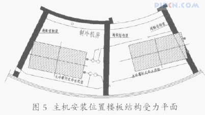 ⑵根据设备所处位置结构分析:主机底部受力及其基础位置不在地板结构受力横梁上,基本为地板主要受力,详见图 5。