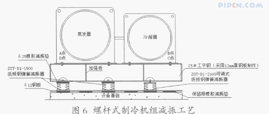 ⑴由于该螺杆式制冷机组的蒸发器和冷凝器分离,加装加装减振器时整体提升中间将受受应力影响,因此底座采用工字型钢将两个容器连接成为同一设备基础底座,设备首先安装在加工后的工字钢上。