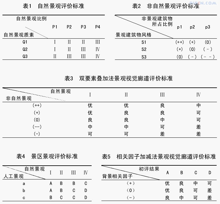 1.1.3 建立景观视觉廊道评价标准 自然景观与非自然景观两者相互依存,相互影响。优美的自然景观配以风格独特的非自然景观才能引人入胜,给游人留下深刻的印象。景观视觉廊道评价标准就是将自然景观和非自然景观的评价结果进行综合叠加,根据两种景观的搭配效果,将景观视觉廊道分为优、良、中、可、差五个等级(表3)。参评人员可遵循前文提到的评价过程中的两个基本设定和所建立的评价标准得到景观视觉廊道评价结果。
