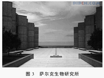 萨尔克生物研究所(图3)位于加利福尼亚州,研究室为8个同等的立方体单元,静静的排列于两侧,“护送”中央的庭院和水池缓缓通向无际的大海,中庭广场没有种植一棵树,也没有布置任何古典柱式和神像,只安排了一组“泰姬玛哈尔陵”式的清列丰盈,错落有致的水池和大理石座,有的尽是“空”的感觉,而厚重的清水混凝土墙与广场上惟一保留的一条小水沟,又将人们的视线引向空广的太平洋,意味深长。这种简洁空灵的处理手法,正是建筑空间留白的体现。