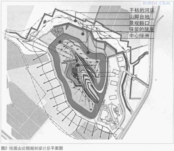 拉茨教授在设计之初,针对垃圾山体的内部变化、生成机理、设计手段和设计尺度进行了一系列思考,同时他意识到只有较好地将山体的表层封闭起来,才能避免雨水渗入地下而导致地下水的污染。在对不同层面的技术问题进行分析之后,拉茨教授突然发现一个致命的问题,即改造这一山体可以利用或依托的文化层面的元素到底有哪些?因为这对于一个场所的独特性创造具有至关重要的意义,如果解决不了,那么前面的所有分析都可能是徒劳的。