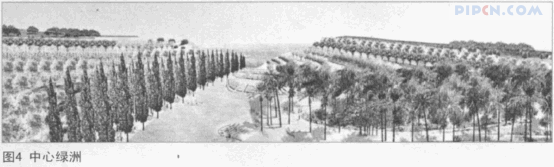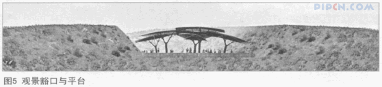 现有的许多提案是将垃圾山塑造成一个大地艺术作品,比如抽象或具象的巨型雕塑。拉茨教授却认为垃圾山绝不仅仅只是一个简单的物质实体,而且还是一个活着的文化景观,是人类正在创造的空间动态结构中的一个组成部分,绝不能将之简单的掩藏或消除后宣告它们不复存在。不过,在维持垃圾山的现状与理想景观的权衡下,拉茨教授亦决定给山体注入一些新的元素,以调整并丰富人们对它的阅读与理解,具体如下:①基于水体的安全,重新调整河道的位置,整理山脚大片土地与植被,确保河水不会被从山体渗出的污水所污染;②从低向高,将山体的断面依次划分为干枯的河床、山脚台地、陡崖、山顶平原及平原中心处的绿洲,每个地区采用不同的植被策略及设计手法,如在最能反映山体原始面貌的陡崖地带,不做人工处理,而是任由野生的物种在其上生长;③在山顶中心下沉处设置绿洲,形成极强的象征意义,通过这种画龙点睛或类似针灸的手法,在原本死气沉沉的垃圾山体中植入一颗绿色的心脏,从而带动该场地的整体复苏;④在山体北侧悬崖的顶部切出一个豁口,创造一个眺望泰尔阿维伊维市全景的绝佳平台,这样既不会影响到山体的轮廓,同时从市区方向看过来,也是一个暗示和标志,以区别于其他自然的山体(图2~图 5)。