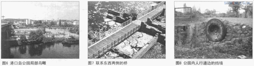 1985 年~1989 年,位于德国萨尔布吕肯市(Saarbrueken)的萨尔(Saar)河畔的港口岛(Hafeninsel)公园改造设计是拉茨教授的又一革命性项目,该港口岛公园原貌为煤炭运输码头。在这个项目里,拉茨教授采用了不同于德国城市公园普遍采用的风景园林形式的设计手法,采取对场地最小干预的方法,以废墟的形式力求保持、揭示场地上被瓦砾所掩盖的历史。拉茨教授大量采用废墟中的碎石瓦砾作为挡墙、台阶等的建筑材料,并用这些材料在公园中垒出了一个方格网,将废墟分割成一块块小花园,构成公园的基本骨架。在公园东西两部分的连结处,即在横跨公园的高架公路下面,拉茨教授将该场地的雨水利用低洼地势汇集形成了一个湖面,将一座桥和砖砌的挡水墙横跨湖面上,以残垣断壁的形式来展示其意境(图 6~图 8)。