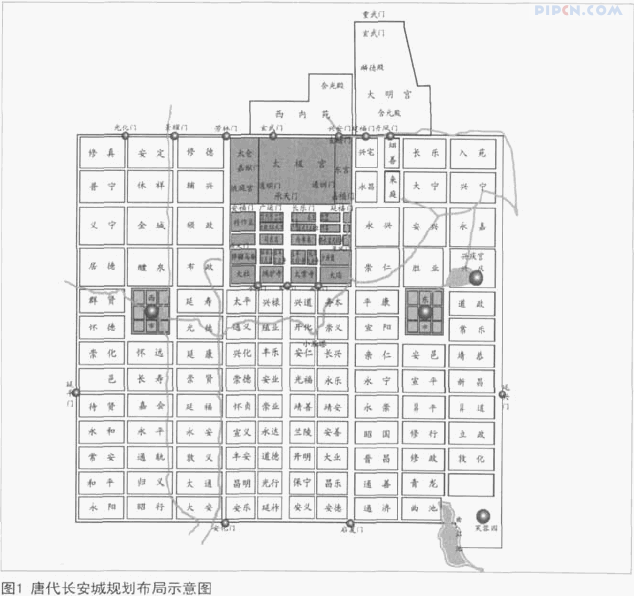 长安城的主要建设特点表现为构图规则且严谨对称(图1),主要表现在: