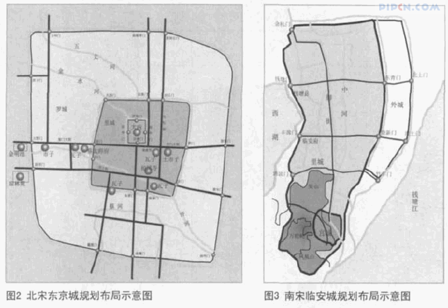 在北宋都城东京城(图2)与南宋都城临安城(图3)规划建设中处处体现着浓重的市井气息与平民文化,主要表现在: