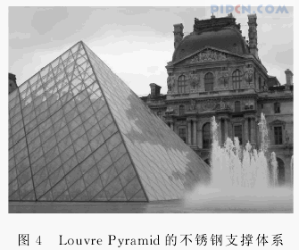 玻璃幕墙由于具有良好的建筑表现能力,近年来在大型公用建筑中获得了广泛的应用。其支承体系多采用耐腐蚀性能好的不锈钢构件,在法国的LouvrePyramid中的应用堪称经典之作[11],为建筑、结构、机械技术绝妙的结合(图4)。