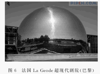 不锈钢具有能经受环境的侵蚀和容易保养的特点,非常适用于作为建筑物的屋盖结构。在对不锈钢进行表面处理以后,可以获得很好的建筑效果。1985年建于法国巴黎的LaGeode超现代剧院就是一个成功应用不锈钢的典范(图6)。它坐落在水池的中央,有着镜面外观,整体呈圆球状。剧院的顶棚和内部结构都靠一根巨大的钢筋混凝土墩来支承,从墩上伸出悬臂以承担横向梁上的荷载。剧院的外表采用15mm 厚,2m 长的不锈钢板,充分利用其良好的耐腐蚀性和表面磨光后易于保养的特点。