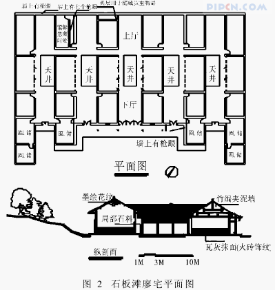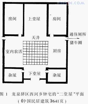 “二堂”屋是成都平原东、北部的客家民居中常见的基本形态,也是晚期移民小家庭常采用的形式。其平面布局实为四面房屋围合而成的四合院(图1),建筑以天井为中心,入口处的下房共三间,中间是下堂(兼出入大门),正房三间,中间为上堂,共有“二堂”,天井两侧厢房各一间,总共八间房屋,民间称其为“硬八间”。