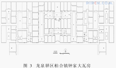 钟家大瓦房是龙泉驿区境内现存不多的聚族而居的客家祖屋之一,祖屋背靠龙泉山脉,面向广袤的成都平原,建筑平面呈凹字形。作为家族中枢的祖堂位于大院的正中,由上下堂和数个天井组成,建筑面积近二百平方米。其中,上堂屋是供奉祖先牌位、祭祀和长辈议事之地;下堂屋则是迎宾等的场所。最初在七间正房两侧建有六横屋,分别隶属于入川始祖荣昌公的六个儿子所居,是三堂六横的形式。随着人口的增多,又在东西两端各加建横屋,最终形成现有的三堂八横布局。各横屋院落内布局相同,都有大门直通室外敞坝———“禾坪”,全屋共有七道大门和二十个大小不等的天井,禾坪南面原还有半圆形月池,总建筑面积约3400平方米。[5]整个建筑附会了原乡“九厅十八井”的布局,既满足小家庭独立、私密———“分”的生活需求,同时又彼此联系构成一个家族———“合”的完整整体,充分显示出聚族而居之功能。
