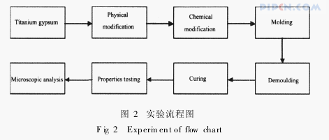 依据GB/T9776-2008建筑石膏标准进行上述实验,并利用KZJ-6电动抗折试验机和YE-30液压式压力试验机测定试样的2h抗折强度、2h抗压强度以及绝干抗折强度、绝干抗压强度(恒温干燥箱内50℃养护3d)。破型后的试样,利用日本日立公司生产的S-2500型IRScaningElectionMlection扫描电子显微镜(SEM)对各试样进行微观形貌观察与分析。实验流程如图2所示。