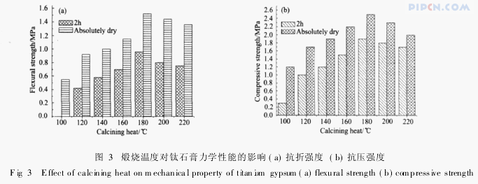 (1)煅烧温度对钛石膏试样的力学性能有较大影响,实验确定的最佳煅烧工艺参数为,在180℃下煅烧3h,在此实验条件下钛石膏试样的力学性能为,2h抗折强度0.96MPa,2h抗压强度1.9MPa,绝干抗折强度1.52MPa,绝干抗压强度2.5MPa;