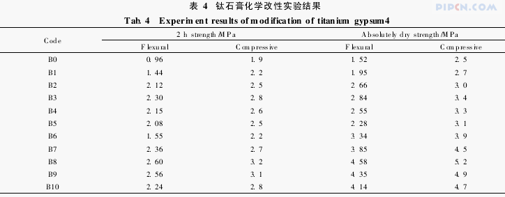 实验采用硫酸钠、生石灰、硅酸盐水泥三种外加剂对钛石膏进行化学改性,考察三种外加剂的不同掺加量配比对钛石膏力学性能的影响,实验结果如表4所示。