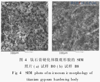 硫酸钠是一种硫酸盐激发剂,对提高试样早期强度效果明显。体系中的硫酸钠主要起到了加快β半水石膏过饱和度形成的作用,从而降低析晶活化能,使析晶速率加快,水化率明显提高。因而,在硫酸钠的作用下,β半水石膏水化生成二水石膏遵循溶解-析晶机理[6]。生石灰的主要成分为CaO,是一种碱性激发剂,对提高试样早期强度效果明显。生石灰与水反应,在石膏料浆中产生游离的Ca2+。这部分Ca2+与半水石膏中的Ca2+发生同离子效应,从而降低半水石膏的溶解度。然而,当硫酸钠和生石灰的掺加量过大时,钛石膏试样表面会析出大量的晶体,其主要成分为Na2SO4和Ca(OH)2,说明过多掺加的硫酸钠和生石灰不能对钛石膏起到激发作用,反而使试样表面出现“返霜”现象,影响钛石膏制品的表观性能。硅酸盐水泥能够提高钛石膏硬化体的强度,这是因为在水泥和钛石膏的水化硬化过程中,形成了一部分硅酸钙、铝酸钙等水化产物,这些水化产物的强度和稳定性均比二水石膏结晶结构的大,在水中的溶解度也小,从而在硬化体中形成较稳定的网络结构,对石膏晶体起到胶结作用。由于硅酸盐水泥的水化硬化周期较长,因此,它对钛石膏试样的后期力学性能的提高贡献较大。石膏硬化体微观形貌的SEM照片如图4所示,图4a为空白试样B0的微观形貌,可见在钛石膏空白试样中,石膏晶体粗大,晶体之间搭接疏松,空隙比较多。图4b是试样B8的微观形貌,可以看出由于硫酸钠和生石灰的作用,石膏晶体细小,彼此搭接致密,石膏硬化体周围紧密结合着水泥水化产物,使石膏晶体紧密结合在一起,空隙数量明显减少。