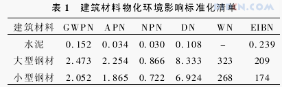 建筑材料的物化环境影响,是指建筑材料“与生俱来”的环境影响,是在使用和处理之前的所有上游过程和活动产生的环境影响的总和。有关水泥、大型钢材和小型钢材的物化环境影响国内龚志起等人已作过统计计算,见表1。其中GWYN、APN、NPN、DN、WN、EIBN分别表示全球变暖影响、酸化影响、富营养化影响、粉尘、固体废弃物和综合环境影响值。