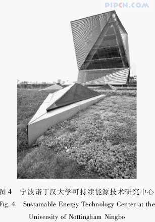 中心,2008 年 9 月投入使用,是中国第一幢零碳排放的节能大楼。大楼通过高性能围护结构、蓄热体、日光及太阳光控制、塔楼的自然通风、试验室和加工间的管道通风等 5 个环境设计战略,最低限度地减少了对加热、冷却和通风额外能源的需求。利用阳光、雨水、地热等可再生资源,自给自足解决用电、用水、供热制冷等问题,整个大楼在运作过程中无任何废气排放。这幢 5 层高的生态楼,造型像变形的魔方,却展示出最新的节能设计理念和绿色建筑技术。大楼拥有先进的太阳能光板、太阳能集热器、风力发电机、地热水泵、雨水收集系统以及电动“智能”窗等,在确保大楼使用舒适度的前提下,提高了能源和再生能源的使用效率,最大限度地降低 CO2 排放,从而减少对环境的影响。大楼同时拥有世界领先的隔震技术,最高可抗 7. 9 级地震。据测算,未来 25年该大楼可节约 448. 9 t 煤和减少1 081. 8 t 碳排放(图 4)[5]。