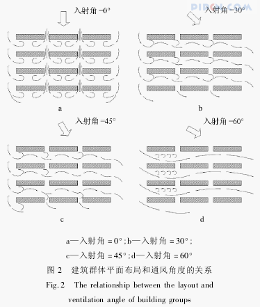 建筑朝向对自然通风、节能省地的影响。对于行列式布局的建筑群体,风的入射角为 45°时,后排建筑的通风要远远优于入射角为 0°时的通风情况(图 2)。在一个居住区,为使建筑群中每一幢房屋都能较好的获得自然通风,建筑物宜与主导风向成30° ~45°角,亦可节约用地,创造优美的社区总平面布置形式。但是从舒适节能的角度考虑,南面或南偏东属于住宅比较好的朝向。上午来自东面的阳光比较温和,经历了一个没有阳光的寒夜,这样的日照是舒适清新之感;而经历了中午的炎热之后的下午,室内热量过剩,应避免西晒。西晒及过度的建筑日照,均不可取。