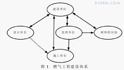 天然气工程的建设体系包括: 燃气建设单位、材料供应商、设计单位、监理单位、施工单位。 后 4 个单位大多由燃气建设单位通过发标的方式确定中标单位。 他们的关系如图 1 所示。 图中双箭头表示合同关系,单箭头表示指令关系,虚线箭头表示协商关系。