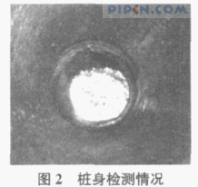 此后对部分管桩进行了清孔检测,孔内摄像见图2,可以看到在桩的接头部位出现渗泥的现象。根据施工情况、静载荷试验曲线以及管桩土塞实测结果,认为桩基静载不合格极有可能与桩身损坏有关。