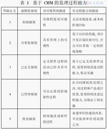 因此,通过以过程为中心的方法管理工程项目的开发,监理方能够标识、了解和解决那些潜在问题[11]。引入CMM模型的监理过程及内容可以由表1来描述。