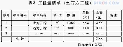 投标单位根据业主提供的招标文件拟定施工方法,通过单价分析并参照以往的经验,对招标阶段的工程量清单各栏目进行报价(包括单价和金额),并签字盖章确认,作为投标文件的重要组成部分。这就是投标阶段的工程量清单形式(见《规范》4.7.2、5.2.5及其条文说明4.3.8、4.4.3、4.7.5、5.2.5等的表述),又称为已报价的工程量清单。仍以土石方工程施工为例,其投标阶段的工程量清单形式(见表2)。