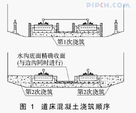 混凝土浇筑采用铺轨预留口或其他投料口下料、轨道运输车运至浇筑部位,轨排铺架机吊运浇筑,插入式振捣器振捣,人工抹面的方法施工。