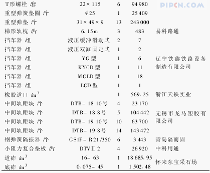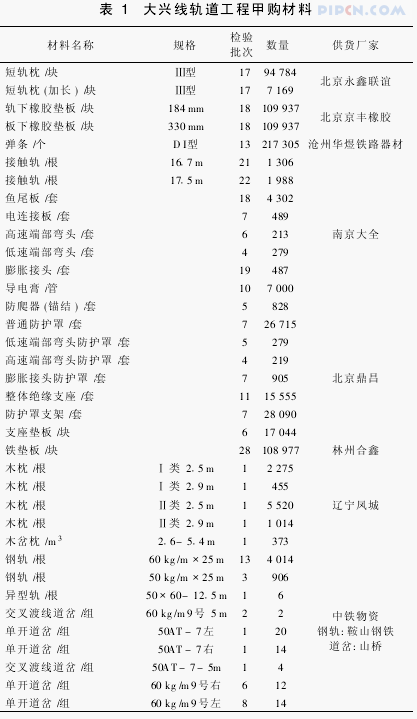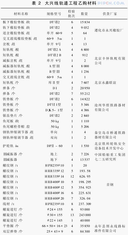 大兴线轨道工程的进场材料根据采购方式分为2类,第一类为甲购,共计8家单位36个种类;第二类为施工单位自购材料共计16家单位57个种类。工程所用材料详见表1、表2。
