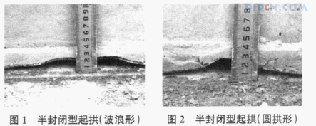 根据这种起拱的外观形状,又可以分为圆拱形和波浪形。相对来说,圆拱形的拱高较大,可达3. 5 cm,后期不易补救,危害也大。波浪形的拱高较小,一般在1. 5 cm左右,但相连数量较多。