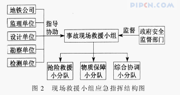 地铁土体塌方较少、事故在可控范围内时,项目负责人担任现场救援小组组长,救援小组由抢险小分队、物质保障小分队、综合协调小分队组成。在应急指挥过程中,设计、地质勘查、检测和监理等人员均应参与应急决策,防止二次坍塌、周围建筑物下沉等次生灾害的发生。事故现场救援小组组织结构如图2所示。