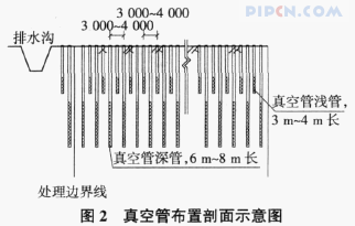 真空管根据土层分布情况分层设置深管和浅管,管间距3.0 m~6.0m,深管和浅管的埋深和间距根据现场详勘后确定。真空排水时间根据“高真空击密”法施工操作要求由现场工程师检测后决定。真空管布置平面图和剖面图分别见图1,图2。