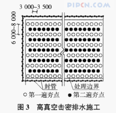 第一次高真空击密排水施工完成后,对沉降量、地下水位等进行监测,处理前后的静力触探对比,根据监测结果调整施工参数,严格控制排水及击密参数,避免形成弹簧土。根据信息化施工判断第一遍高真空击密处理的效果,确定第二次高真空击密的参数,直至达到设计要求(见图3)。
