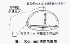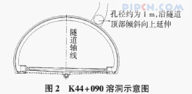 K44+090处溶洞无水也无水流痕迹,故只在隧道初期支护时埋设了5根116的波纹管,以用做排水措施。在K44+063处衬砌左上部和K44+090处衬砌右上部及右下部各预留出一个观察孔,以便观察溶洞后期的涌水量。