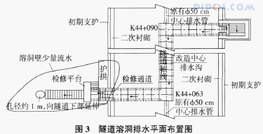 由于原设计洞内排水系统的最大排水能力为60 770 m3/d,无法满足208 800 m3/d最大用水量的要求,所以必须改造原有的洞内排水系统或另外新建一个泄水洞来满足最大涌水量。新建泄水洞能彻底的解决涌水问题,但泄水洞进口地段处于坡积层中,主洞施工时曾产生轻微表层滑动,泄水洞施工存在安全风险。且K44+090溶洞位置距离隧道进口K43+103直线距离就有近1 000 m,泄水洞断面又小,独头掘进施工困难,工期长,投资较大。改造洞内排水系统即将隧道截断的原有的岩溶管道,通过修建仰拱下横向暗沟和改造加宽原有的纵向50 cm的中心排水管连接起来,将K44+090涌水点岩溶水引至K44+063溶洞,再通过K44+063溶洞底部约1 m的岩溶管道将水引入既有的岩溶排水系统。横向暗沟采用1. 4 m×1 m(1. 75%流水坡)断面尺寸,其最大的排水能力为47 000 m3/d,纵向排水沟改造为1. 4 m×1. 4 m的排水沟,满足百年一遇的最大涌水量21 000 m3/d的要求。此方案施工难度小,投资小,工期较短,故选为溶洞处理的实施性方案。溶洞排水平面布置图见图3。