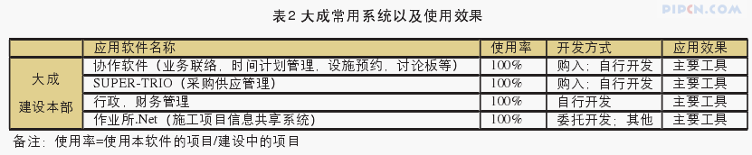 大成建设在企业管理信息化建设方面的主要成果,从公司内部看,实现了信息一元化管理,信息及时处理,排除了重复作业;构建了安全的、高度通用的IT基础设施;建立了基于COBIT的IT管理与控制体系;从公司外部看,实现了与合作企业的施工信息共享,提高了工作效率,降低了工作失误;通过分包单位的电子商务应用,实现了报价、合同签订以及申请业务的高效快速。