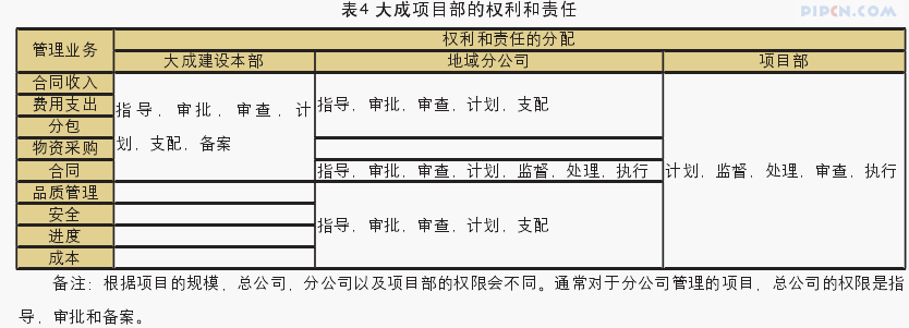 大成建设对项目部的管理,采用的是集约化管控模式,其公司总部和项目部的权责关系见附件表4。