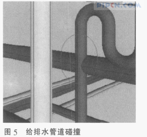 单专业综合碰撞检查相对简单,只在单一专业内查找碰撞,设计者将某一专业模型导入Navisworks,直接进行分析即可。如图5所示,紫色标记的排水管道与另外一根红色标记的管道发生碰撞。
