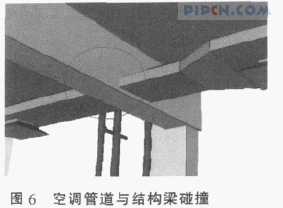 多专业综合碰撞包括暖通、给排水、电气设备管道之间以及与结构、建筑之间的碰撞,为实现准确快速的分析应注意以下两点。首先一栋建筑物内部的管道实体数量庞大,排布错综复杂,如果一次全部进行碰撞检测,计算机运行速度和显示都非常慢,为达到较高的显示速度和清晰度的目的,在完成功能的前提下,应尽量减少显示实体的数量,一般以楼层为单位。另一方面考虑到专业画图习惯,还要能同时检查相邻楼层之间的管道设备,例如空调设备管道通常在本层表示,而给排水专业在本层表示的许多排水管道其物理位置在下一层。图6所示黄色标记的空调给风管道与灰色的结构梁发生碰撞。