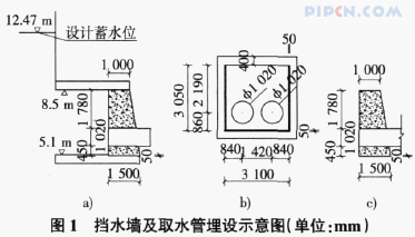 大浪淀水库属国家大(Ⅱ)型封闭式外源性平原水库,是以解决沧州市城市生活用水为主,兼顾工农业生产用水的重要地表水源地。大浪淀水库1996年年底建成,1997年正式向沧州市区供水。2008年沧州市政府决定将大浪淀水引入南皮县城,在大浪淀水库引水枢纽位置修建往南皮县城供水的供水泵站一座,将原引水枢纽的穿堤涵洞作为新建泵站的取水口,并在涵洞内修建挡水墙一座,将两根DN1 020的取水管埋设于挡水墙中(见图1)。(参考《建筑中文网》)