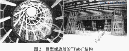在仙台媒体中心里柱子摆脱传统的垂直结构,建筑要素的意义发生了变化,伊东称其为“Tube”。巨型螺旋般的“Tube”结构总共有13根(见图2)。它们的外形是随机而自由的,充满生命力的,如同海藻一样自由伸展、旋转、蔓延。它们形体偏心、失稳、均衡破缺。这些结构从垂直方向上将楼板连在一起,它们既具有传统柱子的结构功能,也充当管道井的角色。成束的钢管形成的中空的柱子,直径从2 m~9 m不等。它们如同这座媒体建筑中的计算机网络一样自由贯穿于建筑的各个部分,“既是骨骼,又是血管,还是神经”,在这里,“结构、机械元素及建筑功能之间的界限消失了”。最后概念形成了仙台媒体中心的最基本的元素:板(地面)、管(柱子)和外壳(正面/外墙)。