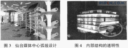 伊东设计的每一件东西都在尝试使建筑摆脱重力并远离形式和重量的共存而产生的矛盾。而在仙台媒体中心(见图1),这个想法得到完美的诠释和放大,创造出了“独一无二”的轻舞飞扬的水立方体,即在建筑中加入很多其他元素后仍然保持原有的风貌。对于伊东丰雄而言,轻盈是他实践其“临时性”理念的必经之路,而途中遇到的主要现实障碍,是沉重而凝固的结构。在他的作品中,伊东丰雄尝试过两种方法去消除这个障碍。首先是创造透明的结构。传统的建筑元素,如梁、柱、内外墙都消失了,仅剩下朦胧化的三个要素:彻底开敞、保持着未完成状态的“平板”(Plate);由原本绝对垂直的柱子演变成的、曲折向上的空心“水草”(Tube)以及飘浮、透明、能呼吸的双层玻璃幕墙———“透明的皮肤”(Skin)。
