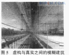伊东如此极速的追求轻快,以至于几乎消失于无形,追求短暂的稀薄状态,用流水来隐喻他的作品。“水族馆里生物所做出的动作的形式比陆地上的生物更清晰明了。生物的形状是他们行为动作的外在表现形式,实际上,它们是‘液态身体’。”在伊东眼中所有的事物都是流动变化的,他很沉迷于水中生物体的自由流动的状态。他认为建筑是衣服的延展,是媒介的外套,是一件意味着数字化和有着透明实体的透明外衣,他用“表皮”来形容这一特质,它们就是媒体森林里的“人猿泰山”。在仙台媒体中心中,建筑是“透明流动的类固态”,是外部优雅的玻璃箱体内部错综复杂的都市材料的组合。支撑六层楼板的管状柱是仙台媒体中心的建筑特色,这些管子在自然状态中都是有生命的,就像植物有它们自己的形状和动作一样。它们是“生物有机体”,在空间上是连续性的。薄薄的四方形薄板在不同高度的空间悬挂,所有功能清楚的加以区分而没有折中的痕迹,建筑的每一层委托给不同的设计者使用不同的颜色,形式及材料,虽然垂直的分解创造出不同材料的层次,但通过表面的表达也延续了透明的设计理念,既而又结合为单一型体积。四个立面以及屋顶各不相同,这完全破坏了人们过去惯用的单一测定体积的表现手法。正面安装了双层玻璃,每层水平状的条纹,营造出微妙的内外视觉差异,白天光线的折射能够使建筑一天当中拥有不间断的外观变化。屋顶和西侧是金属百叶窗做成的覆盖,看上去就像临时建筑,轻质的幕墙托起了建筑本身的体积。东侧和北侧随着楼板的不同而改变材质,透明和半透明的玻璃或金属填塞着空间,这样保持了从内到外同一种材质的延续,虽然与其他三面不同,但这更能直观的体现内部结构的透明性(见图4)。虚构与真实之间的模糊建筑见图5。
