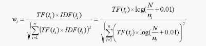 由于各类别文本的长度很难一致,各类文本包含的字数、词数可能差别会很大,对词频造成直接影响,因此通常对词频作归一化处理。TFIDF的归一化计算公式如下: