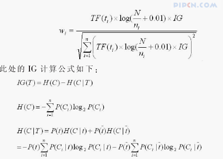 我们从信息论的角度出来,把信息增益考虑进了词语在各文档中的分布比例对权重的影响中。将训练文档集看成一个符合某种概率分布的信息源,词语在文本分类中所能提供的信息量(也就是词语在分类中的重要程度)依靠训练文档集的类别信息熵和文档类别中该词语的条件熵之间信息量的增益来确定。并且将这种重要程度反映到了权重计算公式中,提出了如下TF.IDF.IG权重计算公式: