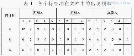 可以通过一个很小的文档集来说明权重计算方法TFIDF的利弊问题,假设有三个类别c1,c2,c3,每个类别中都各有5篇文档,为了计算方便这里只考虑三个特征项t1,t2,t3。