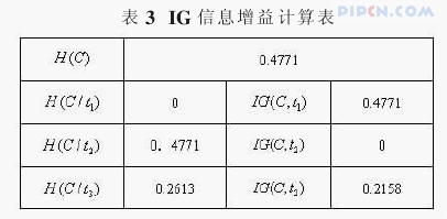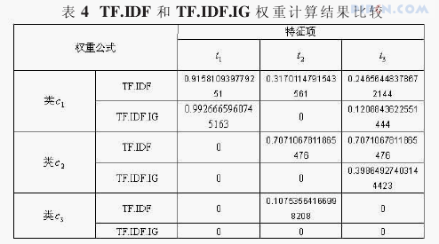 IG的值越高,表示特征项对于分类所能提供的信息量就越多,从表3中可以看出,IG的计算结果与我们主观判断的结果是相同的。t1只在类c1中出现,所以其对于分类的结果应该是最重要的,t3次之,而t2由于是三个类别中均出现过,所以其对于分类的结果是最不重要的,它对于分类的信息增益值也是最小的。再来看看将IG考虑进权重计算公式后,词语的权重,并与传统的权重计算公式的结果相对比。