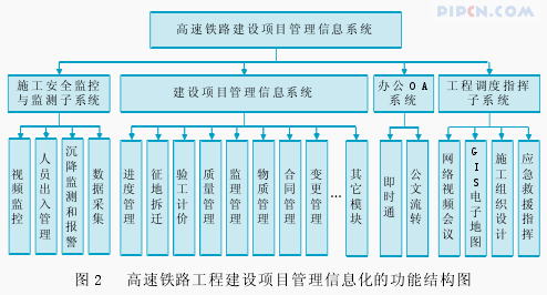 高速铁路建设项目管理信息系统主要面向领导,面向管理决策层,面向工程施工调度人员的用户。通过GIS电子地图为平台,以互联网络为通道,信息管理软件为核心,以视频会议和视频监控系统为辅助,最终把全线所有的施工数据信息进行集成,汇总分析,形成各类施工调度报表;把全线的工程进度通过GIS电子地图形式呈现在在工程调度指挥中心的大屏上。其主要功能结构如图2。