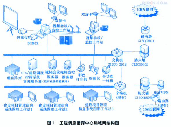 为保证各级工程建设指挥部对工程调度指挥的及时性、科学性、高效性,高速铁路建设总指挥部根据其管理模式和组织机构,应该成立工程调度指挥中心,建设一套高速铁路建设调度指挥系统。工程调度指挥中心是调度指挥管理系统的核心,在总体架构设计上充分考虑系统技术先进性、未来可扩展性的同时,兼顾技术的成熟性,最大限度的保证系统的安全可靠。其工程调度指挥中心局域网结构如图1。