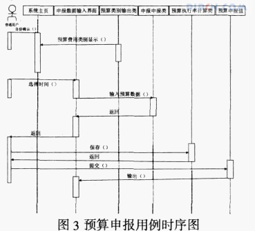 这里用时序图来描述用例的动态行为。时序图是按时间排序的交互图,采用从上到下的顺序来表示时间的顺序。图3是预算申报用例的时序图。其主要过程是:普通用户登录后进入该用户所属部门的预算申报数据输入界面,输入界面显示该部门预算费用类别的相关信息;输入该部门所有预算费用的数据;在输入界面点击保存按钮,系统会根据所填写的预算费用数据计算出当月的预计预算执行率;点击提交按钮提交最终确定的预算申报数据。